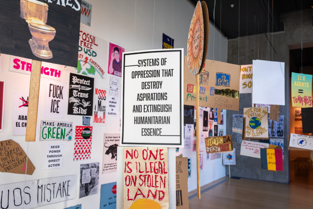 With the support and guidance of a faculty dedicated to student education and organization, the students successfully collaborated to produce this art poster exhibition. The San Diego College Gallery utilizes its social media platforms to invite all students and community members to submit protest signs through a call for submissions. This call was a complete success, as the exhibition titled RESIDENCE IN MOTION | Art. Activism. And Belonging will be on display from September 4 to October 23, 2025.