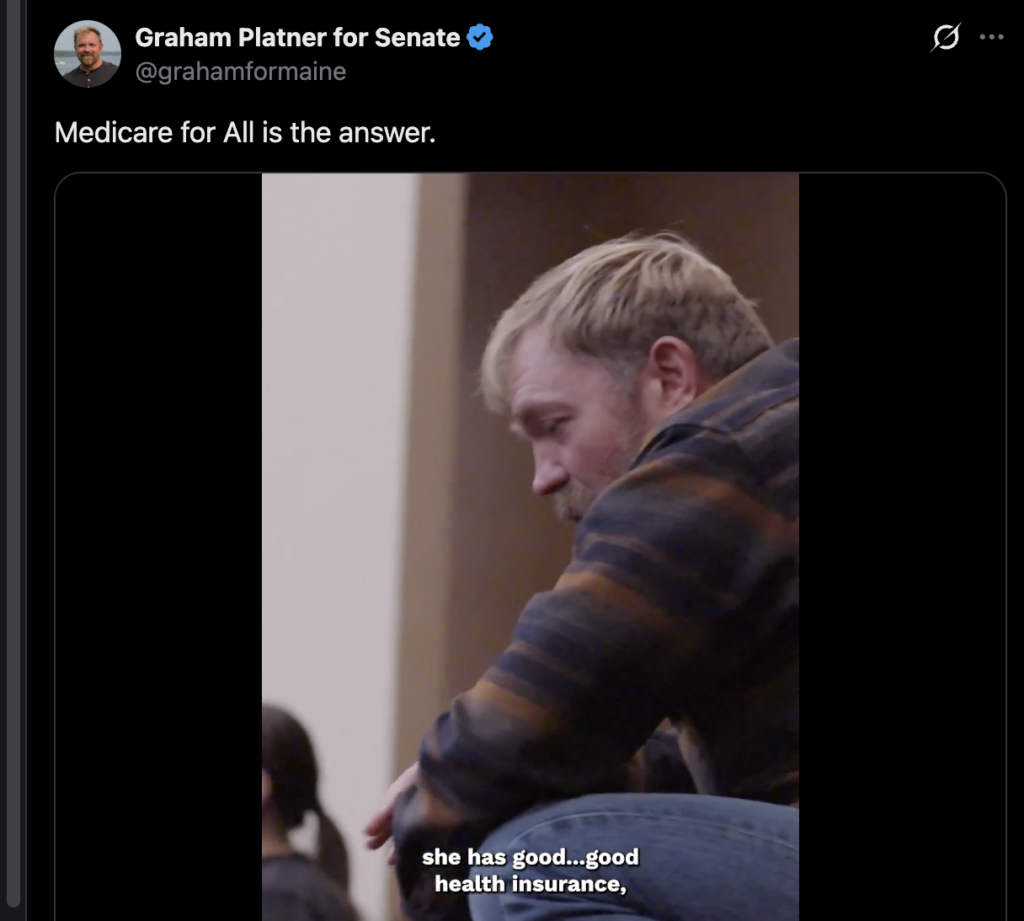 Platner has spoken out forcefully in support of Medicare for All, saying unequivocally last month that the proposal “is the answer” to numerous healthcare crises, including the loss of primary care providers in many parts of the country and skyrocketing healthcare costs.