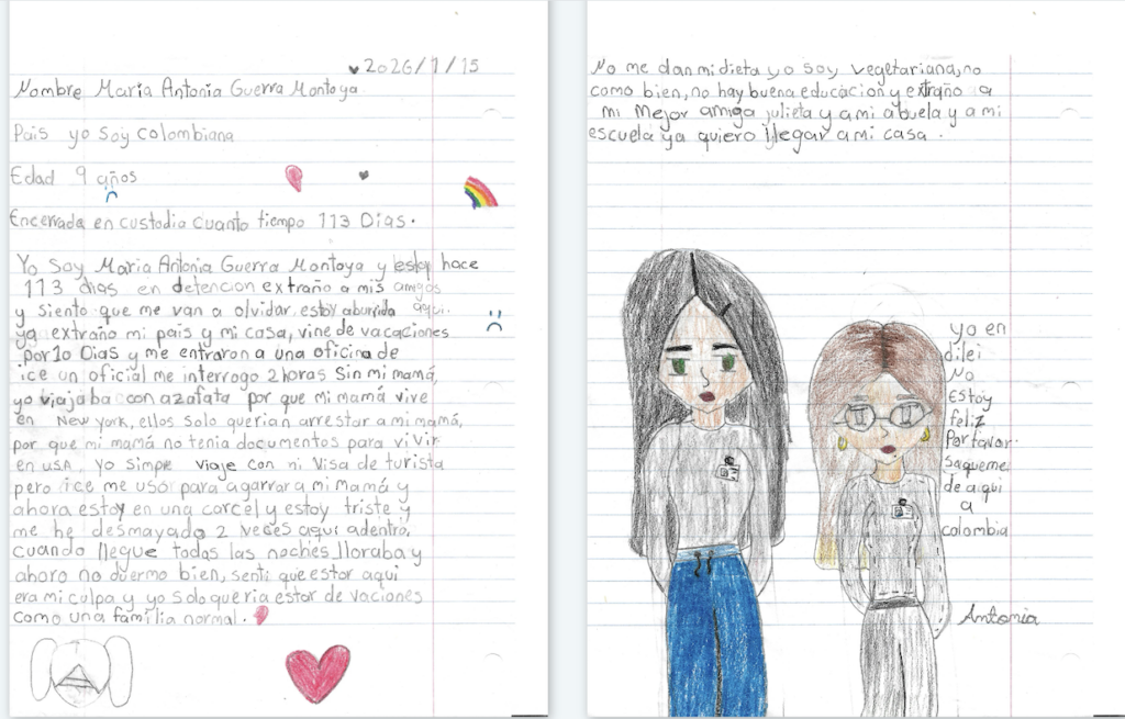 I am Maria Antonia Guerra Montoya and I have been 113 days in detention I miss my friends and I feel they are going to forget me. I am bored here. I already miss my country and my house, I came on vacation for 10 Days and they took me into an ice office an officer interrogated me 2 hours without my mom, I was traveling with flight attendant because my mom lives in new york, they only wanted to arrest my mom, because my mom didn’t have documents to live in U.S.A., I always traveled with my tourist visa but ice used me to catch my mom and now I am in a jail and I am sad and I have fainted 2 times here inside. When I arrived every night I cried and now I don’t sleep well, I felt that being here was my fault and I only wanted to be on vacation like a normal family.