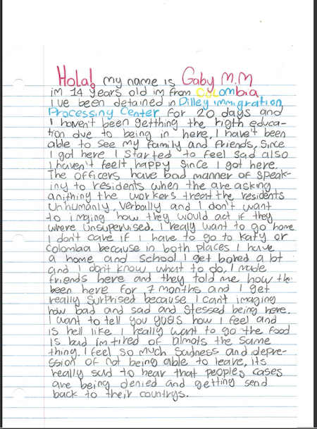 “Hello, my name is Ariana V.V. im 14 years old and im from Honduras, ive been detained for 45 days and I have never felt so much fear to go to a place as I feel here everytime I remind myself that once I go back to Honduras a lot of dangerous things could happen to my mom and my younger siblings haven’t been able to see their mom in more than a month. They are very young and you need both of your parents when you are growing up. Since I got to this Center all you will feel is sadness and mostly depression. When people have their courts the longest they will last is 15 minutes, our rights are not being provided, arrest are happening when people don’t even have any type of order, arrests are happening illegally.