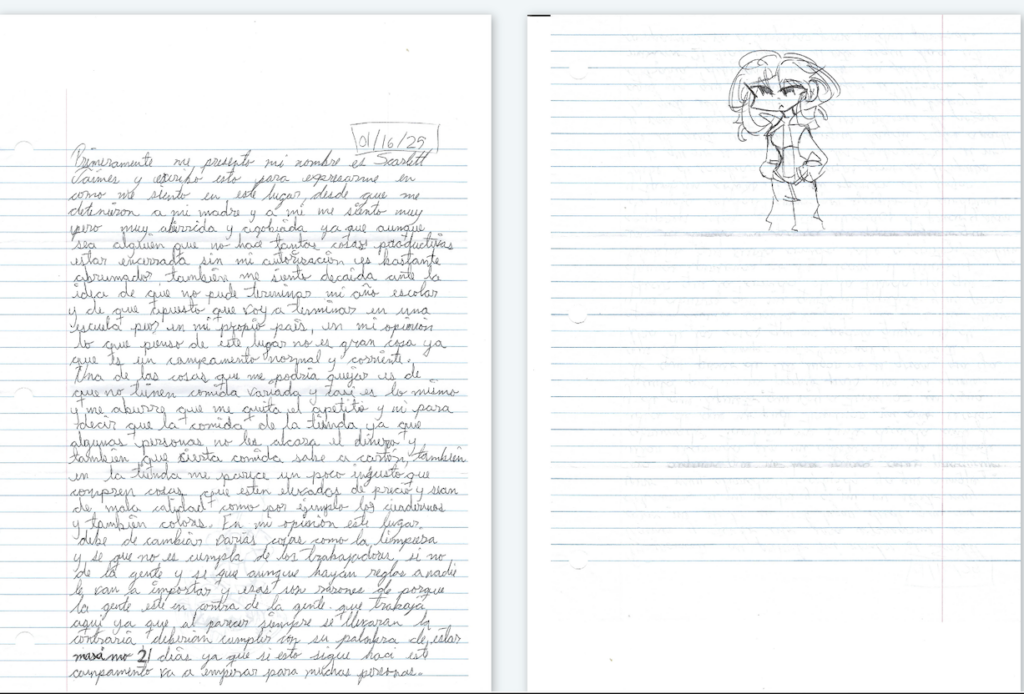 First of all I want to introduce myself my name is Scarlett Jaimes and I am writing this to express how I feel in this place, since they detained my mother and me I feel really, really bored and overwhelmed because even though I am someone who doesn’t do many productive things being locked up against my will is quite overwhelming, also I feel down about the idea that I couldn’t finish my school year and that I bet I’m going to end up in a worse school in my own country, in my opinion what I think about this place is not a big deal since it’s a normal and ordinary camp.One of the things that I could complain about is that they don’t have varied food and it’s almost the same and it bores me and I lose my appetite and I am not going to even mention the store food because some people don’t have enough money and also some food tastes like cardboard, also in the store it seems a little unfair to me that they buy things that are high priced and bad quality like for example the notebooks and also colored pencils. In my opinion this place has to change several things like the cleanliness and I know it’s not the workers’ fault but the people’s and I know that even if there are rules nobody is going to care about them and that is why people are against the workers here because it seems that there will always be conflict they should keep their word of keeping people a maximum 21 days because if this continues like this this camp is going to get worse for many people.”