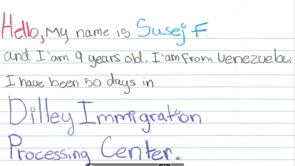 “Hello, my name is Susej F and I’am 9 years old. I’am from Venezuela. I have been 50 days in Dilley Immigration Processing Center. And I want to go to my Country. But I miss my school and my friends I feel bad since when I came here to this Place, because I have been here too long. I have been 2 years and 6 months in united states, and I was happy with my friends in The school but now I need to leave. I miss my family in my country so now I want To go to Venezuela. But my mom do not want to leave because she wants a better future for me. Seen how people like me, immigrants are been treated changes my perspective about the U.S. My mom and I came to The U.S looking for a good and safe place to live, and my mom was looking for a Good job.”