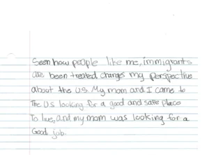 “Hello, my name is Susej F and I’am 9 years old. I’am from Venezuela. I have been 50 days in Dilley Immigration Processing Center. And I want to go to my Country. But I miss my school and my friends I feel bad since when I came here to this Place, because I have been here too long. I have been 2 years and 6 months in united states, and I was happy with my friends in The school but now I need to leave. I miss my family in my country so now I want To go to Venezuela. But my mom do not want to leave because she wants a better future for me. Seen how people like me, immigrants are been treated changes my perspective about the U.S. My mom and I came to The U.S looking for a good and safe place to live, and my mom was looking for a Good job.”