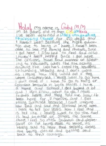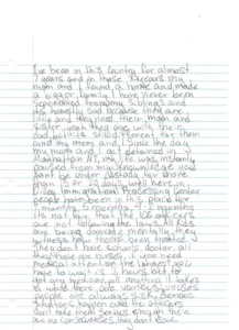First of all I want to introduce myself my name is Scarlett Jaimes and I am writing this to express how I feel in this place, since they detained my mother and me I feel really, really bored and overwhelmed because even though I am someone who doesn’t do many productive things being locked up against my will is quite overwhelming, also I feel down about the idea that I couldn’t finish my school year and that I bet I’m going to end up in a worse school in my own country, in my opinion what I think about this place is not a big deal since it’s a normal and ordinary camp.One of the things that I could complain about is that they don’t have varied food and it’s almost the same and it bores me and I lose my appetite and I am not going to even mention the store food because some people don’t have enough money and also some food tastes like cardboard, also in the store it seems a little unfair to me that they buy things that are high priced and bad quality like for example the notebooks and also colored pencils. In my opinion this place has to change several things like the cleanliness and I know it’s not the workers’ fault but the people’s and I know that even if there are rules nobody is going to care about them and that is why people are against the workers here because it seems that there will always be conflict they should keep their word of keeping people a maximum 21 days because if this continues like this this camp is going to get worse for many people.”