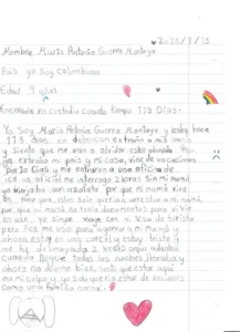 “Hello my name is Mia Valentina Paz Faria I am from Venezuela I have been living in the United States for 3 years, I am 7 years old, I have been here for 70 days in this place, I don’t want to be in this place I want to go to my school, I miss my grandparents, I miss my friends, I don’t like the food here, I miss my school, I don’t like being here, I am bored here, I don’t feel so good in this place, I already want to leave this place, I miss my uncles, I hope to leave here soon.”